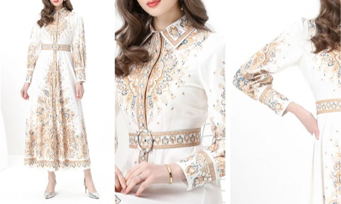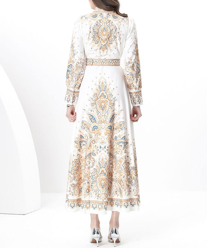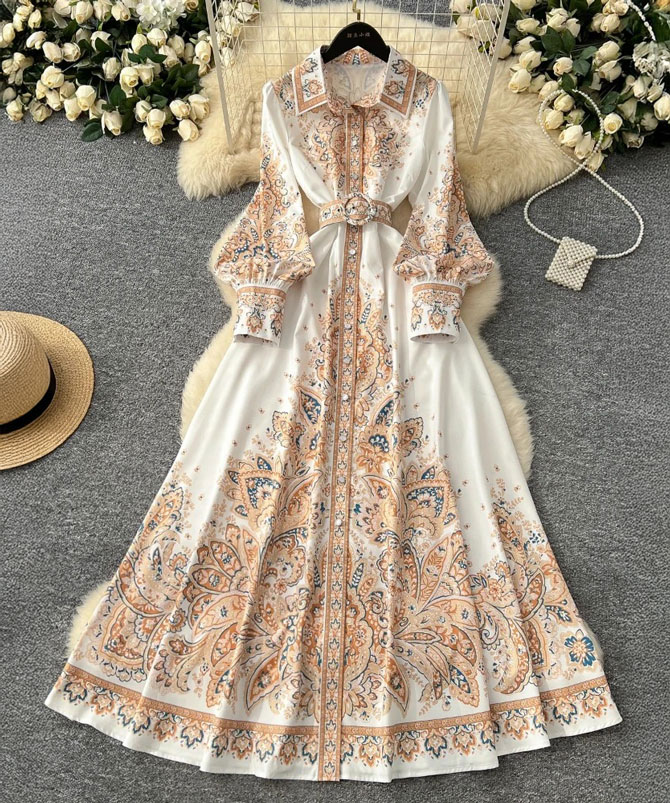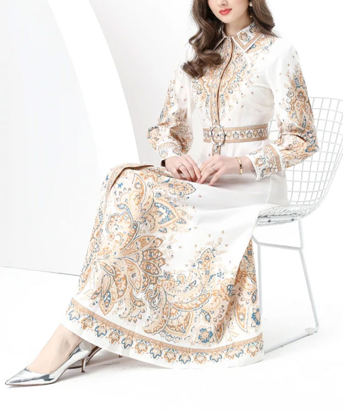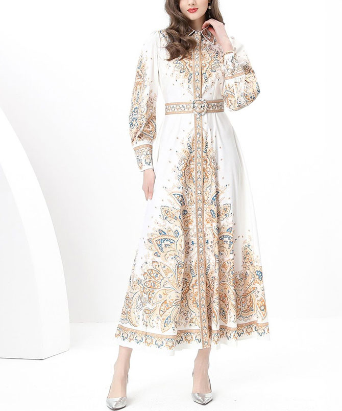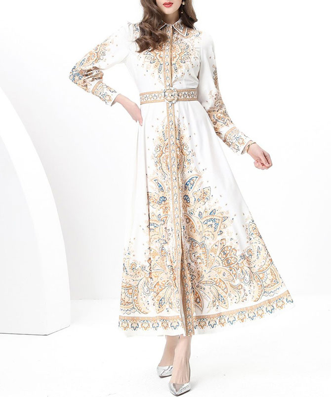 The dress features a lovely ivory base covered in golden baroque-style prints that give it a classy yet modern vibe. The collared neckline and button-down front keep it stylish and polished, while the matching belt cinches your waist just right. The long sleeves with detailed cuffs add a little extra flair.