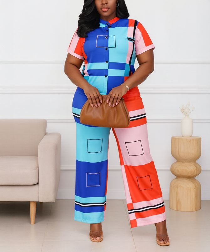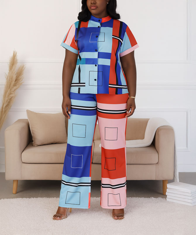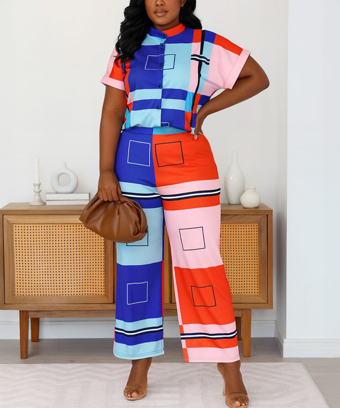 With its bold mix of blue, red, pink, and teal blocks, this Two-Piece set instantly brightens your mood and your style. The relaxed shirt and wide-leg pants combo is super comfy yet effortlessly chic, perfect for days when you want to look stylish without even trying.