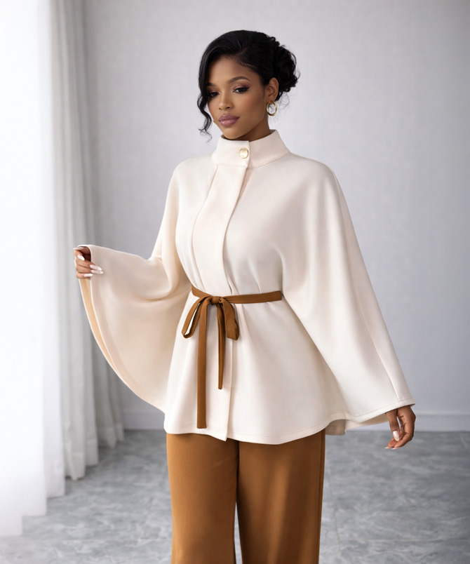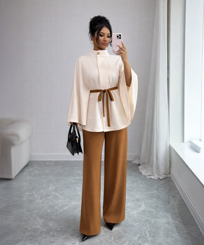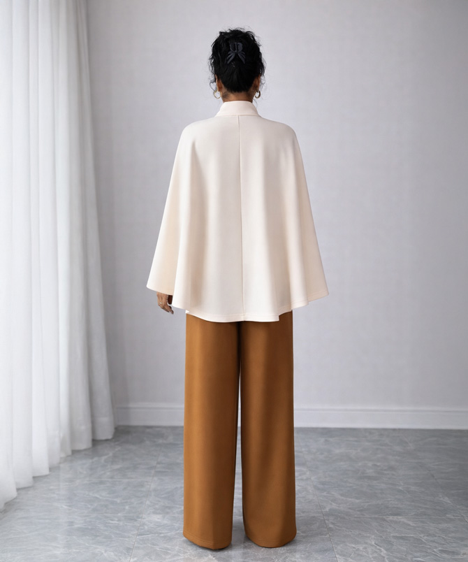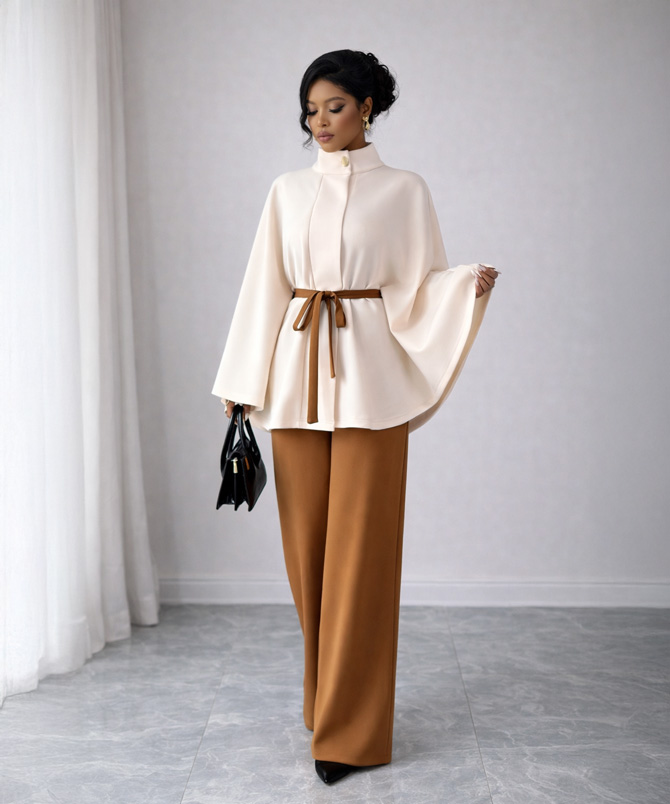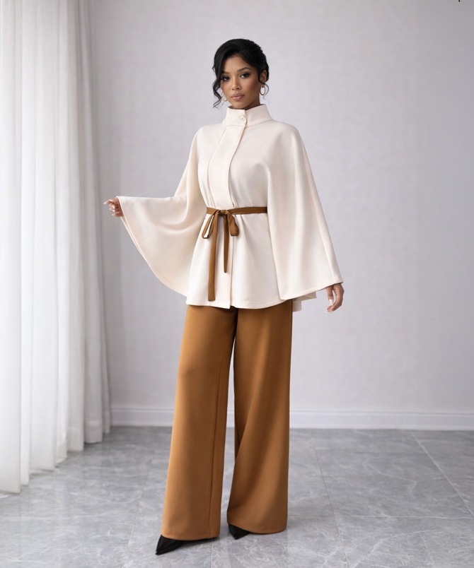 There is something effortlessly powerful about simplicity done right, and the Ivory Aura Cape Set captures that feeling beautifully. Designed in a soft, flowing crepe wool blend, this two piece set pairs a graceful cape-style top with tailored wide leg trousers in a rich caramel tone. The contrast feels warm, refined and quietly luxurious.