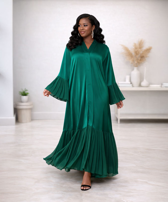 The deep emerald green hue exudes sophistication and regal charm, perfect for the modern woman who desires both style and modesty. The flowing silhouette is accentuated by meticulously pleated bell sleeves and a pleated hem, adding movement, texture, and an air of exquisite elegance to your look.