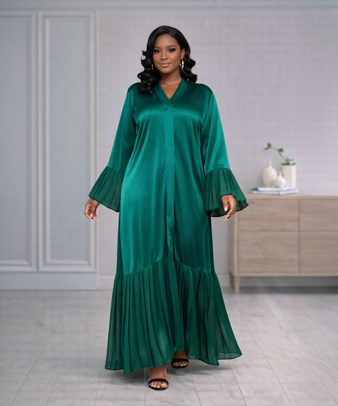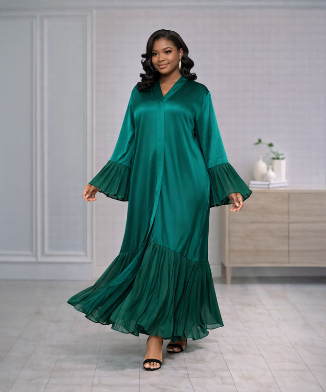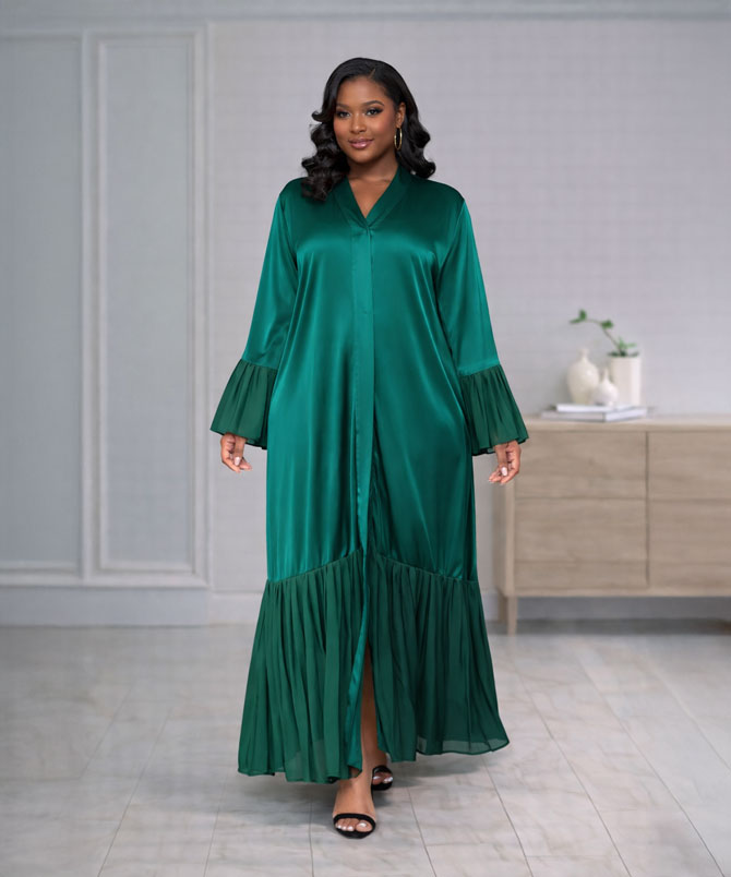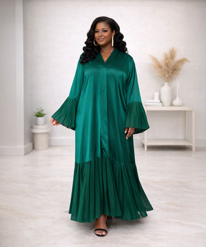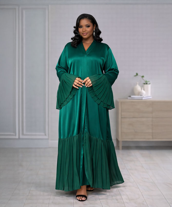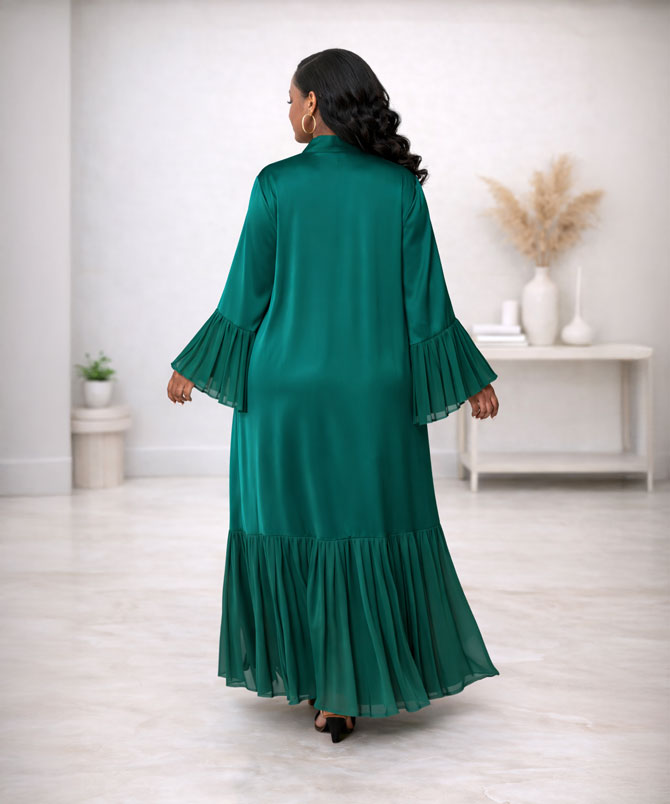 The deep emerald green hue exudes sophistication and regal charm, perfect for the modern woman who desires both style and modesty. The flowing silhouette is accentuated by meticulously pleated bell sleeves and a pleated hem, adding movement, texture, and an air of exquisite elegance to your look.