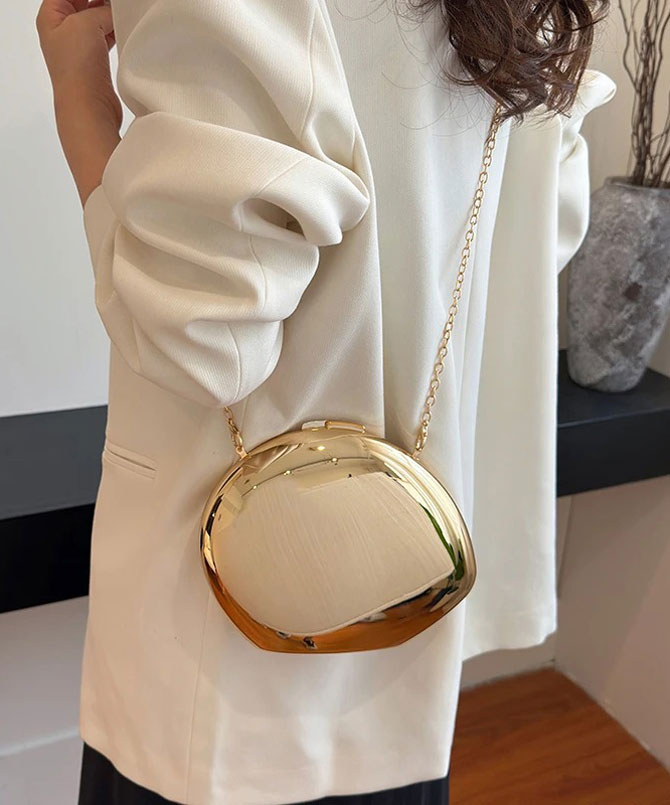 Drape yourself in opulence with the Luminous Shell Clutch Bag, a stunning piece that seamlessly blends modern elegance with timeless charm. Available in two captivating shades – Radiant Gold and Mirror Silver – this clutch reflects not just light but your unique sense of style. Its sleek, sculptural silhouette and polished acrylic finish create a statement of sophistication that’s impossible to ignore.