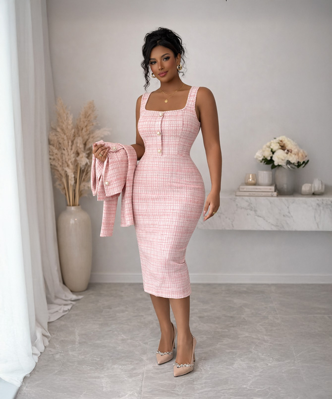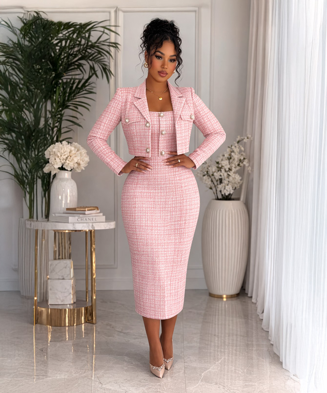 Designed as a chic two piece, this set features a sleek sleeveless bodycon dress paired with a cropped tweed blazer jacket that adds just the right touch of structure and sophistication. Together they create a look that feels polished, feminine, and undeniably stylish.