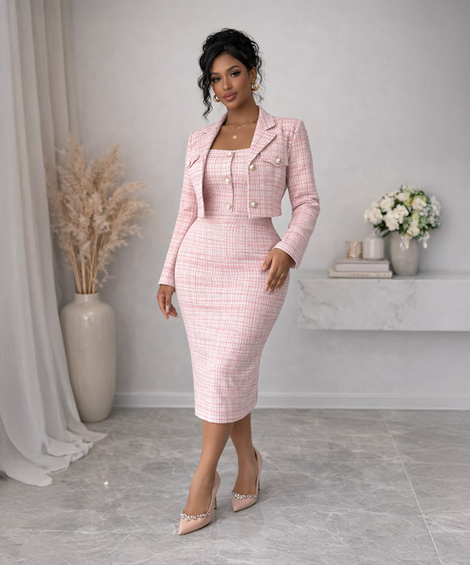 Layered on top is the short tweed blazer jacket, designed with a cropped cut that sits perfectly at the waist to enhance your shape. The blazer features a tailored lapel collar and elegant button accents that mirror the dress, creating a cohesive and thoughtfully styled look.