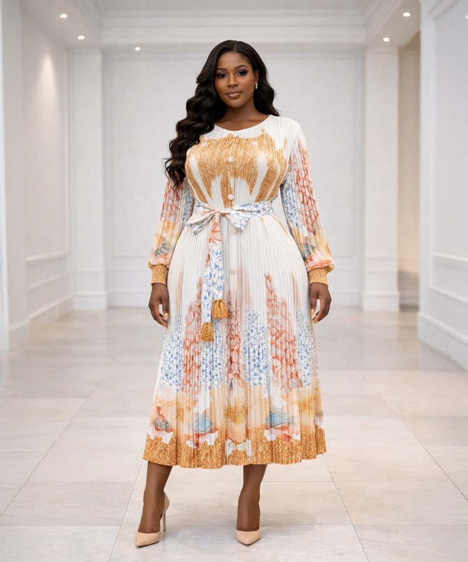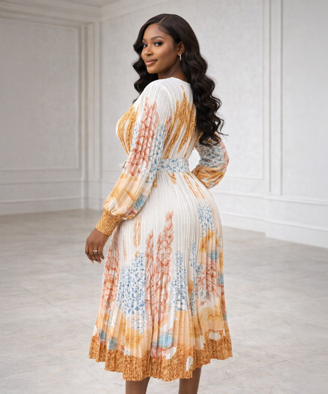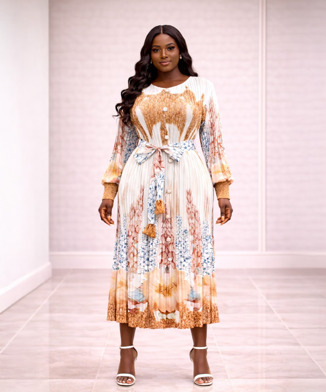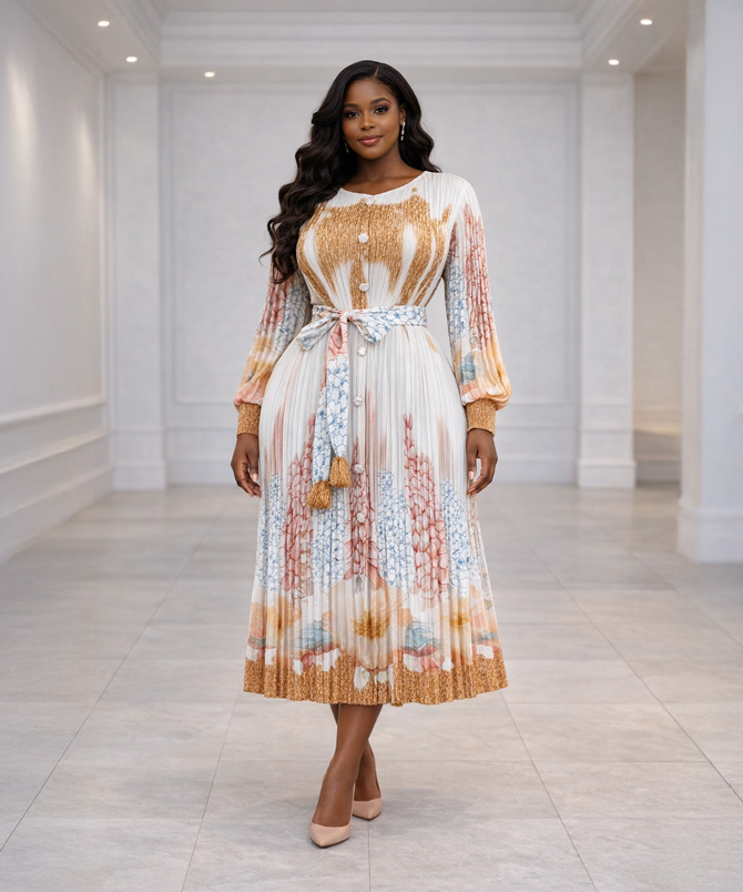 A matching fabric belt softly defines the waist, giving you a flattering silhouette without ever feeling restrictive. The long sleeves with gathered cuffs add a polished finish, making this dress perfect for brunch dates, resort getaways, family gatherings, or those days when you simply want to feel effortlessly put together.