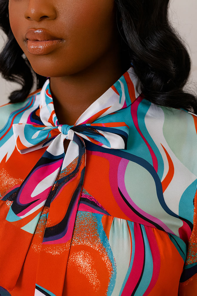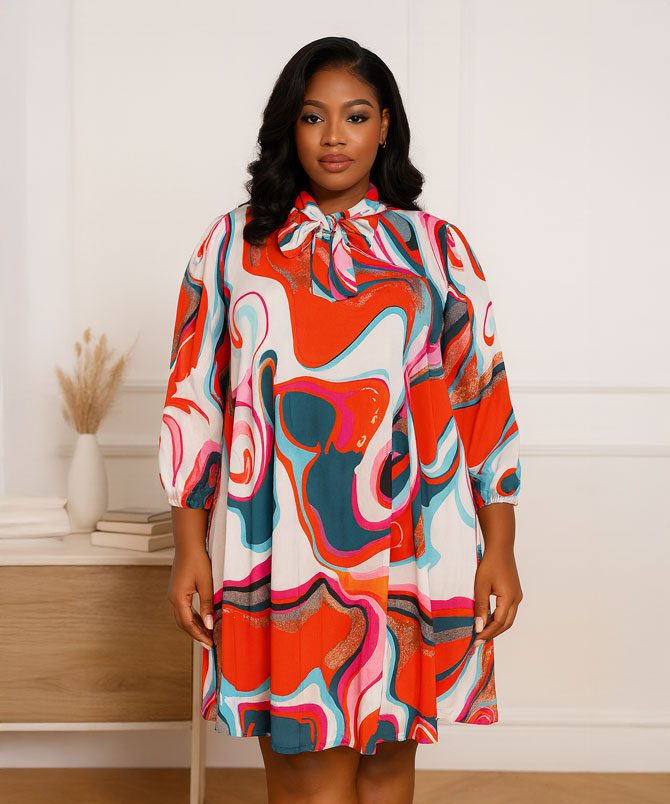 The Pleated Shift Dress is a burst of color and confidence. With its bold, artistic print and flowy pleated fabric, it’s the kind of dress that brings joy the moment you put it on. The loose, easy fit gives you all-day comfort, while the bow-tie neckline adds a playful touch.