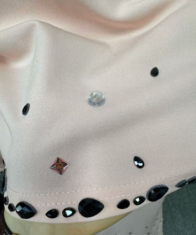 - Color: Soft blush pink with multi-hued rhinestone sparkle