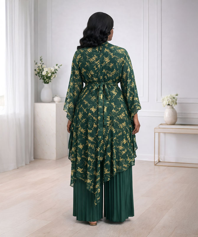 The Script Luxe Two Piece Set is not just an outfit. It is confidence wrapped in emerald and gold.
