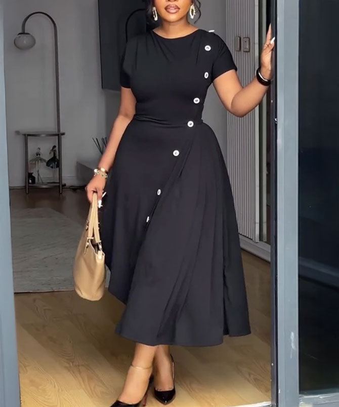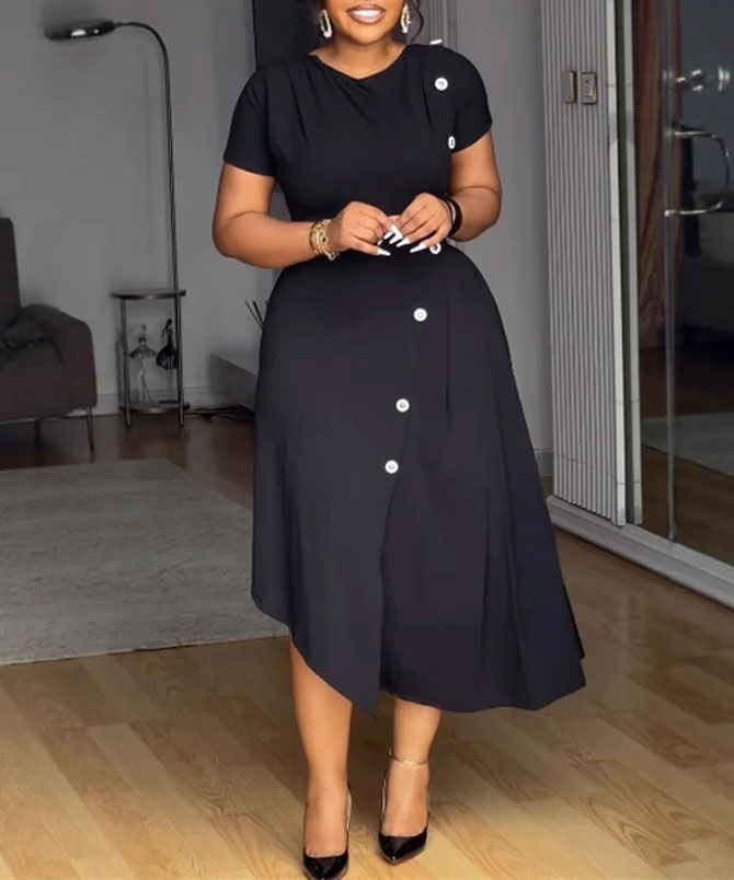 This dress features a soft, round neckline paired with short sleeves, keeping the look modern and easy to wear. The real charm lies in its asymmetrical button detailing, cascading from shoulder to hem in a playful diagonal line. The unique button placement adds movement and intrigue, creating an eye-catching flow that feels both artistic and fashion-forward.